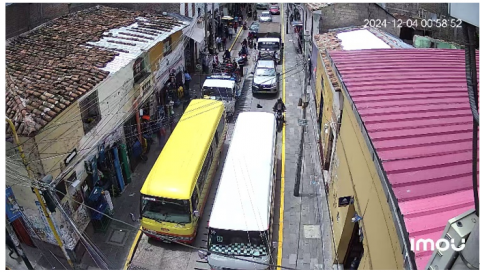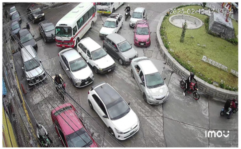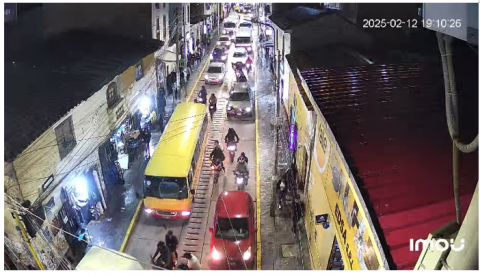 Images were captured under diverse traffic conditions during peak hours (7:30–8:30 AM, 1:00–2:30 PM, 6:30–8:00 PM), while also collecting a significant amount of data during periods of lower vehicular congestion. Furthermore, images were captured under various lighting conditions, including sunny days, rainy weather, sunsets, nighttime scenes where vehicle high beams create glare phenomena, and shadow scenes caused by colonial buildings. Figures 3-8 illustrate representative samples of image captures under different environmental conditions: sunny conditions (Figure 3), shadow conditions caused by colonial structures (Figure 4), cloudy conditions (Figure 5), sunset scenarios (Figure 6), nighttime conditions (Figure 7), and precipitation conditions (Figure 8). This diverse variety of data is fundamental for training the model to identify objects reliably and accurately, regardless of the lighting conditions present. This diverse variety of data is fundamental for training the model to identify objects reliably and accurately, regardless of the lighting conditions present.