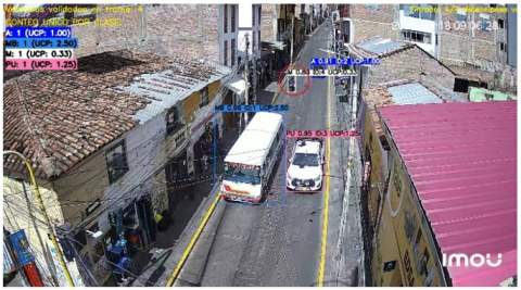 The temporal distribution presented in Table 5 demonstrates comprehensive system evaluation across critical traffic periods and diverse environmental conditions characteristic of Ayacucho's historic center. The 17-hour monitoring framework strategically captures peak traffic scenarios including morning rush hours (07:48 AM), midday congestion (12:29–12:44 PM), and evening traffic intensification (17:17–19:52 PM), alongside challenging weather conditions including heavy rain with wind and varying precipitation intensities. This extensive testing protocol ensures robust validation of the detection system's performance under real-world operational conditions typical of historic urban centers, where environmental variability significantly impacts traffic monitoring effectiveness. The inclusion of diverse lighting conditions from cloudy dawn (05:44 AM) through sunset transitions (16:21–17:51 PM) to complete nighttime scenarios (18:48–22:48 PM) validates the system's adaptability to the full spectrum of operational requirements. Furthermore, the evaluation encompasses shadow interference from colonial architecture during sunny periods, demonstrating the system's resilience against the unique challenges posed by heritage urban environments with their characteristic narrow streets and historic building configurations.