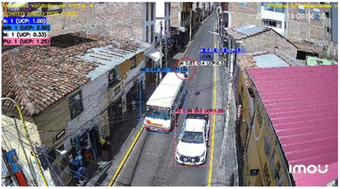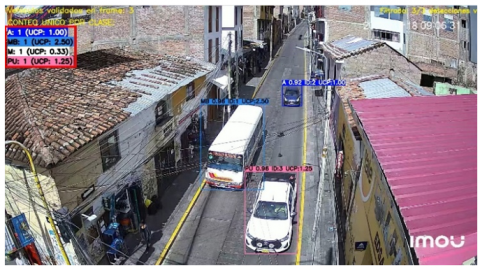 Figures 23 and 24 demonstrate the system's effectiveness against shadow conditions caused by Ayacucho's colonial mansions, showcasing temporal filtering for false positive elimination. Figure 23 illustrates dynamic classification refinement, where the small truck counter (CP) shows zero because the system correctly reclassified the vehicle as a large truck (CG) as it approached closer. This adaptive classification demonstrates temporal filtering's capability to improve detection accuracy by continuously evaluating vehicle characteristics across frames. The system successfully detects 9 vehicles with high confidence scores (0.62–0.98) despite shadow interference. Figure 24 validates sustained performance with 4 detected vehicles, maintaining reliable classification (A, M) with confidence scores above 0.84. Both images confirm the system's robustness against shadow interference typical of narrow historic streets, validating the model's adaptability to heritage urban center challenges.