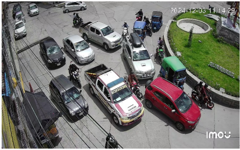 Figures 25-27 demonstrate the system's occlusion handling capability in confined urban spaces where smaller vehicles frequently become hidden behind larger ones. Through temporal tracking that assigns unique identification codes to each detected vehicle, the system maintains accurate records even when vehicles temporarily disappear from view. Figure 25 shows initial motorcycle detection at 09:06:28 am with clear visibility and high confidence (0.92). Figure 26 captures the critical moment at 09:06:30 am when the motorcycle is about to be occluded by the microbus. Figure 27 illustrates complete occlusion at 09:06:31 am where the motorcycle remains registered in the counting system despite being entirely hidden. This sequence confirms the system's capability to handle challenging detection scenarios in historic urban centers, where narrow streets and mixed vehicle sizes create frequent occlusion situations.