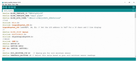 The Arduino IDE is the program that we experimented with for this work. It's similar to the popular free tool that's used by all Arduino tinkerers. It's incredibly user-friendly for programming those little computer boards we call Arduino Modules because it's the real deal, designed by the people who created Arduino themselves. These modules are now really intelligent little brains with microcontrollers within. They only need to be fed some code, and they will follow your instructions. The Arduino IDE functions similarly to their own computer, allowing you to program all the exciting features you desire. The editor and the compiler are its two chief allies. The compiler is similar to a grammar checker for code; it ensures that everything you write makes sense before sending it to the Arduino board. The editor is similar to your notepad, where you jot down all your brilliant ideas. Once you have finished writing your masterpiece, you will receive a Hex File, which is simply a fancy term for a file that contains instructions for the microcontroller. The Arduino Module merely needs to be uploaded to the board in order for it to begin operating. Playing telephone is similar, but instead of whispering "I love you," the instructions are more along the lines of "turn on the light" or "move the robot arm." You can think of the code you write as a set of instructions that explain what occurs when an input and output are broken down. All you have to do is feed it the information you want it to know, process it using some logic, and then program it to perform an action in the actual world, such as turning on a light or rotating a wheel. It's similar like giving advice to a friend, but with a lot less argument and a lot more technical terminology. We will be writing code in the embedded C language within the Arduino IDE. The ESP8266 microprocessor that we have set up will receive the code that is entered into the Arduino IDE editor and uploaded to its memory. The DT22, flame sensor, PIR, and soil moisture sensor, among other sensors, will receive this code as instructions and be sent into them. These sensors will use the ESP8266 microcontroller to measure the necessary parameters and transmit the results to the Blynk Cloud. The Arduino IDE is displayed in Figure 11.