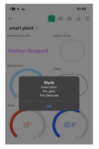 As illustrated in Figure 15, the fire sensor transmits information to the Blynk program, which notifies people about the existence of a fire in an area, when it is exposed to high temperatures and starts a fire in a nearby region.