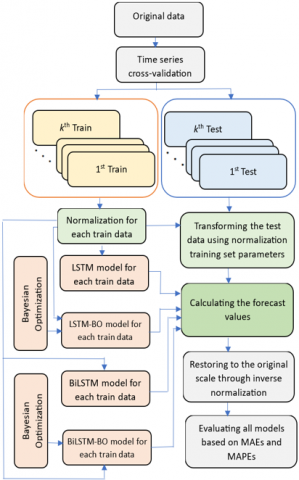 Hyperparameter selection plays a crucial role in achieving optimal performance. Yet, many studies still rely on fixed or heuristically chosen hyperparameters, which can limit the model’s generalization ability across different time periods or geographical contexts. Common optimization strategies, such as grid search or random search, are widely used but are computationally expensive and time-consuming [18-20]. More recently, Bayesian optimization has emerged as an efficient alternative, offering faster convergence to optimal solutions [21, 22], and improved forecasting performance [23, 24]. Unlike other optimization algorithms, Bayesian optimization (BO) uses a surrogate probabilistic model and an acquisition function [22] to systematically explore the hyperparameter space, making it well-suited for complex models such as LSTM and BiLSTM.