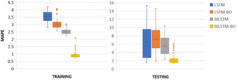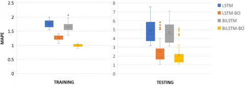 Figure 9. Boxplot for the MAPEs obtained from LSTM and BiLSTM models with and without BO for the monthly electricity consumption in Brazil