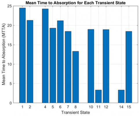 The absorption probability matrix (Table 2) and Figure 3 indicate a significant convergence toward Absorbing State 13, which corresponds to complete system failure due to cascading unit failures with a non-functional switch. Across all transient states, this state dominates the long-term failure landscape, capturing between 55% and 89% of all absorption pathways. Notably, States 1, 4, 5, 7, 10, 11, and 15 exhibit AP into State 13 exceeding 70%, indicating that once the system enters these configurations—typically involving partial degradation and switch stress—it is highly likely to progress irreversibly toward total collapse.