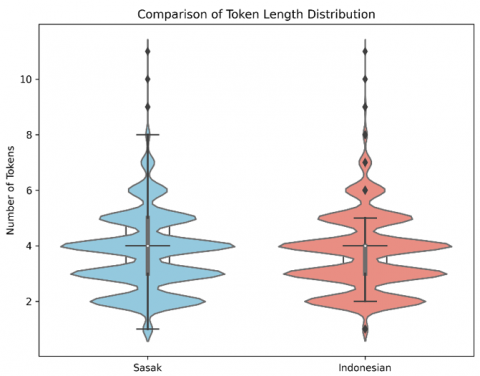 The parallel corpus consisting of 10,000 sentence pairs can be categorized as a medium-sized dataset for research on low-resource languages. This amount is consistent with prior studies in the development of machine translation systems for minority languages, which typically employ corpora ranging from thousands to tens of thousands of sentence pairs [1, 2, 35]. Based on the analysis of the 10,000 Sasak–Indonesian parallel sentence pairs, the corpus exhibits diverse linguistic characteristics. On the Sasak side, the vocabulary size reaches 5,517, while the Indonesian vocabulary consists of 4,256 entries. This difference indicates that Sasak possesses greater lexical variety, likely influenced by dialectal variations, morphology, and more complex word derivations compared to Indonesian. Furthermore, sentence length analysis shows that the maximum number of words in a single sentence for both languages is relatively balanced (up to 11 words), which facilitates alignment in the translation model. The sentence length distribution for each language is illustrated in Figure 4. The violin plot demonstrates that token lengths in Sasak and Indonesian are relatively balanced, with similar medians and dispersions. This suggests that sentences in both languages tend to be comparable in length when measured by token count. Such a balance is important because it allows the model to learn cross-lingual representations more stably without significant disparities in input–output lengths. Thus, this dataset not only holds practical value for building a Sasak–Indonesian translation system but also contributes to efforts in preserving and digitizing regional languages within both academic and technological domains.