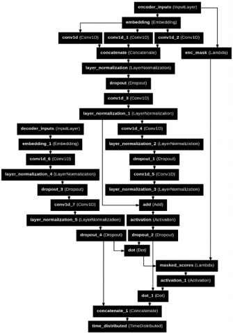 The modeling in this study was designed to leverage three types of data representations: TF-IDF, IndoBERT contextual embeddings, and tokenizer-based embeddings. Since each representation possesses distinct characteristics, the model architecture was tailored accordingly to optimally extract information from each input form. For TF-IDF and IndoBERT representations, the sequential order of words in a sentence is no longer explicitly preserved. TF-IDF converts text into a static high-dimensional vector that solely represents word weights, while IndoBERT, in this implementation, produces a single embedding obtained through mean pooling of hidden states. Consequently, both representations are more similar to text classification approaches than to pure sequential modeling. To overcome this limitation, the feature-extracted vectors are fed into dense layers to generate compact representations, which are then repeated across the length of the target sequence via a repeat vector operation. These repeated representations are subsequently processed by convolutional blocks in the decoder, enabling the model to learn sequence patterns even though the initial input lacks explicit sequential information. An attention mechanism is then employed to align the global representations with the target tokens being predicted.