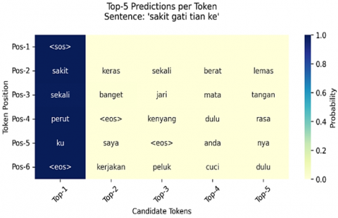 During model training, token-level accuracy was used as an initial metric to monitor the proportion of predicted tokens that matched the reference tokens. In the evaluation stage, this study focused on measuring translation quality using the Bilingual Evaluation Understudy (BLEU) metric. The main principle of BLEU is to compare machine-generated translations (candidate translations) with reference translations produced by native speakers or language experts. The evaluation process is carried out by calculating the modified n-gram precision, which considers clipped counts to prevent the model from achieving a high score merely by excessively repeating certain words. In addition, BLEU also applies a brevity penalty (BP) to control the tendency of the system to produce shorter sentences that may appear correct in terms of precision but are semantically incomplete. Furthermore, the BLEU metric evaluates translation quality from two perspectives: adequacy, through word-level precision, and fluency, by computing n-gram precision at levels n = 1, 2, 3, and 4 [33]. Precision is calculated by dividing the number of matched n-grams by the total number of n-grams. The precision for the n-th n-gram ($p_n$) can be formulated as in Eq. (7).