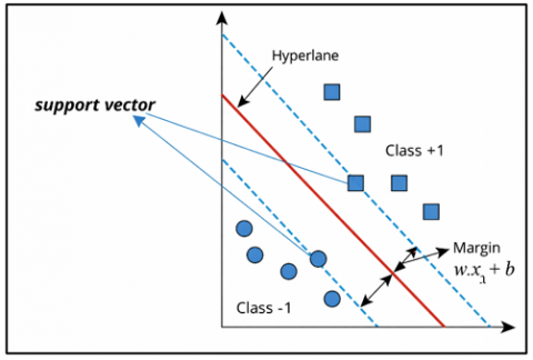 Figure 1. SVM structure for classifying two classes (+1 and 1) based on the hyperplane line [21]