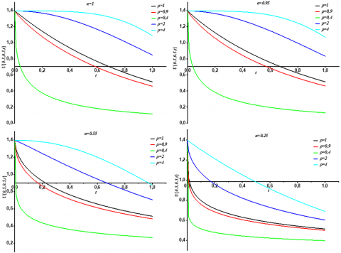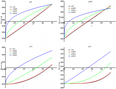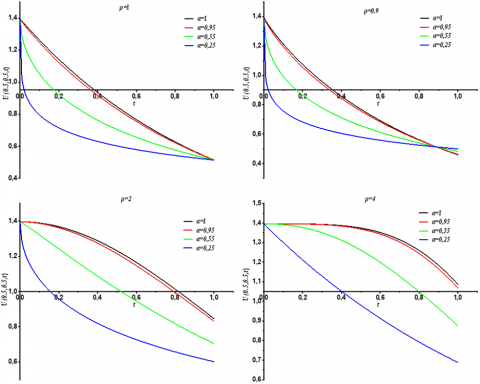 Figure 7. The graphs of Eq. (59) for the values of parameter $\rho$ with, $a=0, \alpha=1, \alpha=0.95, \alpha=0.55, \alpha=0.25$