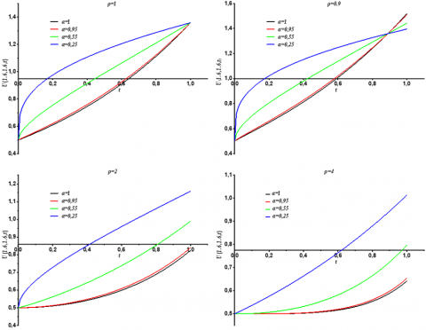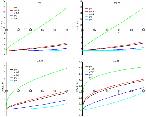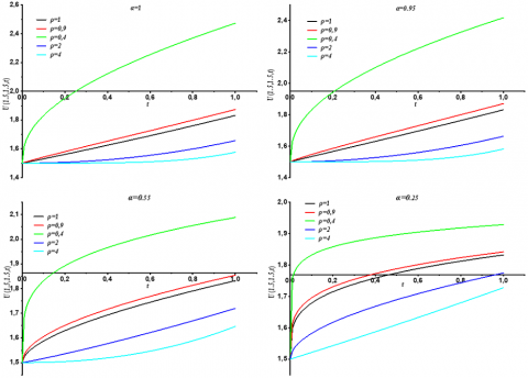 Figure 8. The graphs of Eq. (59) for the values of parameter $\alpha$, with $l=\frac{1}{5}, a=0 \rho=1, \rho=0.9, \rho=0.4, \rho=2, \rho=4$