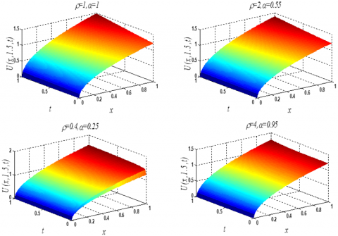 Figure 9. The surface shows the behaviour of solution $U(x, y, t)$ of the third application using Eq. (59) with regard to $t$ and $x$ such that $(\rho=2, \alpha=0.55),(\rho=1, \alpha=1),(\rho=4, \alpha=0.95),(\rho=0.4, \alpha=0.25), y=1.6, x=t=0: 0.01: 1$
