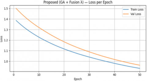 Figure 4 depicts the loss reduction trends during the training process of the model optimized using the GA + Fusion-λ approach. At the beginning of training, the training loss was recorded at approximately 1.38, while the validation loss was around 1.50. As the number of epochs increased, both curves demonstrated a consistent downward trend until the end of the training at epoch 50, where the training loss approached 0.95, and the validation loss stabilized at approximately 0.98.