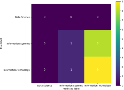 Figure 5 presents the confusion matrix resulting from the evaluation of the GA + Fusion-λ model over 50 epochs using the dataset of the 2024 student cohort at Universitas Katolik Santo Thomas Medan. The three predicted study programs were data science, information systems, and information technology. The evaluation results indicate that the data science class was not detected at all, reflecting the issue of data imbalance. For the Information Systems class, only one sample was correctly classified, while most were misclassified as Information Technology. Conversely, Information Technology obtained the most dominant predictions, with nine samples correctly classified.