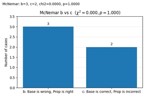 In Figure 6, the value of b = 3 represents the number of cases in which the baseline model produced incorrect predictions while the proposed model generated correct ones. Conversely, the value of c = 2 indicates cases where the baseline was correct but the proposed model was incorrect.