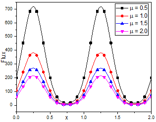 Figure 12. Variation of $\mu$ on flux vs. $x$ with $\tau=0.5, \phi= 0.5, a_1^{\prime}=0.2, a_2^{\prime}=0.3, t_1=13, t_2=300$