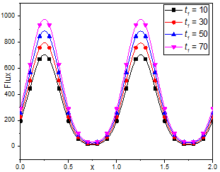 Figure 14. Variation of $t_1$ on flux vs. $x$ with $\tau=0.5, \phi= 0.5, a_1^{\prime}=0.2, a_2^{\prime}=0.3, \mu=0.5, t_2=300$