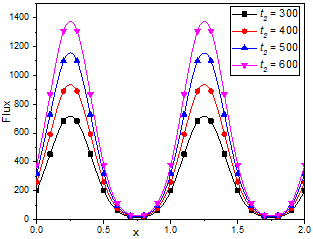 Figure 15. Variation of $t_2$ on flux vs. $x$ with $\tau=0.5, \phi= 0.5, a_1^{\prime}=0.2, a_2^{\prime}=0.3, t_1=13, \mu=0.5$