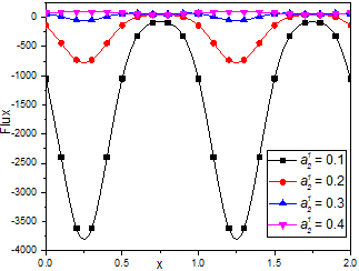 Figure 17. Variation of $a_2^{\prime}$ on flux vs. $x$ with $\tau=0.5, \phi= 0.5, \mu= 0.5, a_1^{\prime}=0.2, t_1=13, t_2=300$