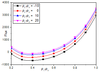 Figure 19. Effect of $p_1-p_0$ on flux vs. $p_2-p_0$ with $\tau=$ $0.5, \phi=0.5, \mu=0.5, t_1=13, t_2=300, x=0.1$