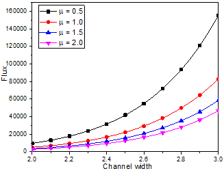 Figure 8. Effect of $\mu$ on width of the channel vs. flux with $\tau=0.5, x=0.1, \phi=0.5, t_1=13, t_2=300$