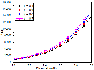 Figure 9. Effect of $\phi$ on width of the channel vs. flux with $\tau=0.5, x=0.1, \mu=0.5, t_1=13, t_2=300$
