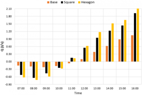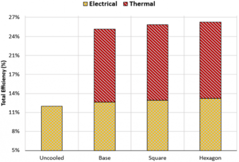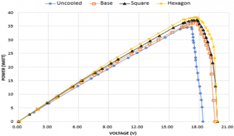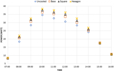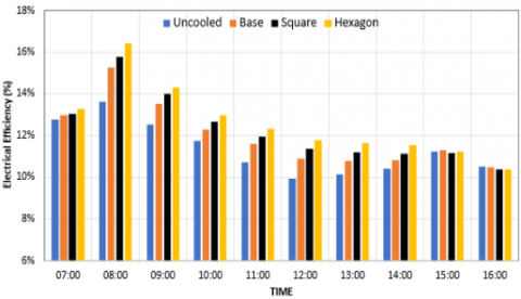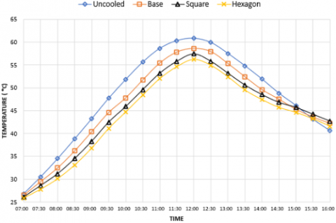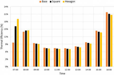 The three tested configurations (Base, Square, and Hexagon) reveal that the hexagon model emerges as the most promising design. It demonstrates sustained peak electrical conversion rates across the diurnal cycle, with notable preeminence during periods of maximal solar irradiance, and manifests enhanced thermal regulation capacities, particularly during the crucial early morning and extended afternoon intervals. This is attributed to its geometric efficiency in maximizing surface area for heat transfer while promoting a more uniform thermal gradient within the PCM.