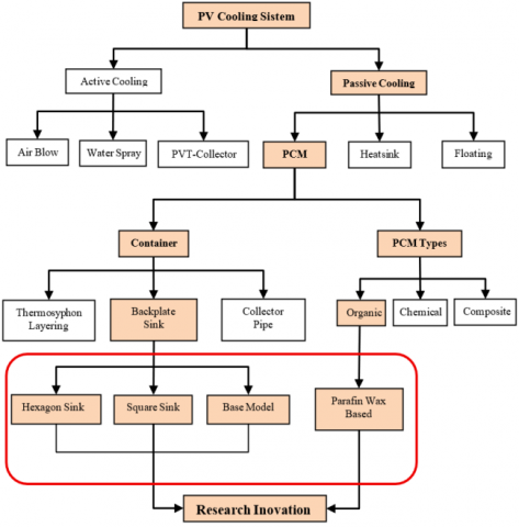 This investigation is methodically structured to ascertain the efficacy of PV installations augmented with PCM. The research trajectory is depicted in the flowchart presented in Figure 1, with a discernible emphasis on a particular area of inquiry. Broadly construed, two principal determinants can influence the operational efficiency of the PCM thermal regulation system applied to the panel: the design of the containment vessel and the specific classification of PCM employed [19]. The area of the circle is the focus of research that explores various heat sink designs for PCM containers explicitly.