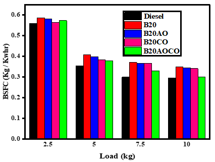 Figure 2 illustrates the BSFC values with and without the addition of additives in biodiesel. It observed that BSFC of B20 blend rises as compared to diesel and B20 blend with nano additives decreased as contrasted to B20 blend. B20AOCO showed low BSFC as correlated to other B20 blends, and it was approximately equal to diesel at full load. Biodiesel has a low calorific value of up to 10% as contrasted to diesel. B20 blend gave only 2% less CV value than conventional fuel, so most of the researchers used B20 blend as fuel on a CI engine. Biodiesel blend with additives increases the CV value of fuel blend because of high CV, high surface to volume ratio, better air-fuel mixing, rapid evaporation, and atomization. Yet lower BSFC reported by use of biodiesel with additives as contrasted with biodiesel. Another reason for enhanced BSFC is the friction step-down quality of amines.