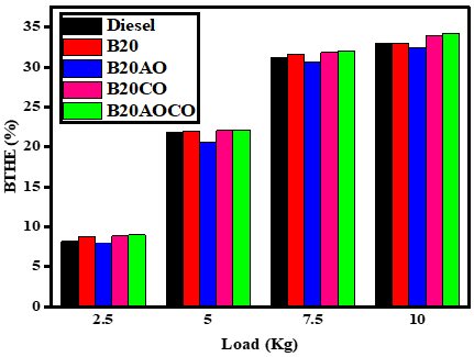 From Figure 3, B20AOCO showed high BTHE as correlated to other fuels at full load. Biodiesel showed complete and elegant combustion, which gave high brake thermal efficiency (BTHE) compared to diesel fuel. But it somewhat raises BTHE by adding nanoparticle and antioxidant additives into B20 blend. The BTHE of biodiesel blend with additives enhanced as contrasted to biodiesel, because of high CV, high surface to volume ratio, better air-fuel mixing, rapid evaporation, and atomization. Nanoparticles dispersed with biodiesel act as an oxidation catalyst, and it led the catalytic combustion resulting in higher BTHE contrasted with biodiesel.