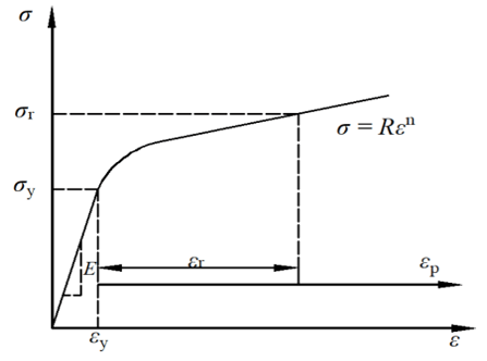 It is assumed that the uniaxial stress-strain relationship of metal materials obeys Hooke's law at the elastic stage and conforms to the power-enhanced exponential function model distribution and satisfies the Von Mises yield criterion at the plastic stage, as shown in Figure 7. The elastic-plastic power strengthening stress-strain relationship is expressed as [5]: