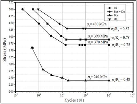 The Specimens treated with direct quenching after boriding treatment exhibited a 79% increase in fatigue life compared to those with boriding treatments only [15], highlighting the effectiveness of this combined approach in enhancing the material’s durability under cyclic loading conditions. The specimens that underwent direct quenching exhibited a significant increase in fatigue life, with an approximate 79% improvement over the borided specimens and a 10 % increase compared to the control specimens. The boriding treatment decreased the fatigue life by approximately 62% compared to that of the control specimens. It has been observed that boriding negatively affects the fatigue resistance of steels, particularly when the thickness of the boride layers ranges between 100 and 350 µm, this observation was confirmed after analyzing the results of several research studies [16]. The fatigue limit Ϭe was determined at the number of cycles N = 105 using a staircase procedure. The fatigue limit Ϭe in the case of the borided substrate was Ϭe = 240 MPa and for the specimens having direct quenching after boriding treatment Ϭe = 370 MPa the increase is 54%, as show in Figure 6 and Table 6. Fatigue rate Ϭe/Rm went from Ϭe /Re = 0.48 to Ϭe/Re = 0.75. In the case of the untreated control specimens, the fatigue limit Ϭe was Ϭe = 390 MPa and for the specimens having direct quenching only Ϭe = 430 MPa, the increase is 10%, as shown in Figure 6 and Table 6. The fatigue ratio Ϭe/Re has increased from Ϭe /Re = 0.78 to Ϭe/Re = 0.87. It is evident that direct quenching itself can also increase the fatigue limit of the material, although the increase is not as great as that observed in the boriding process followed by direct quenching.