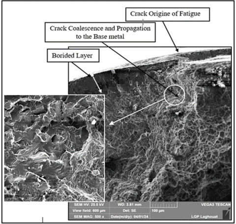 This phenomenon highlights the possibility of the treated surface to develop structural discontinuities under the effect of repeated stresses in the cases of thick layers with the presence of vertical cracks which propagate vertically inside the base metal and concentred residual stresses in the substrate surface due to differences in the expansion coefficients thermal [17]. This observation shows us the potential weaknesses in thick boride layers, which are thicker than 25 microns, where cracks initiate and propagate. Examination of the fracture surfaces using a scanning electron microscope (SEM) Figure 8 shows that rupture of hollow specimens is the result of crack propagation initiated at the substrate surface shape.