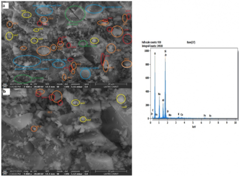 The results obtained demonstrate that the geopolimerization band Si-O-T has shifted to a lower wavelength, this shift is attributed to the reduction in the geopolymer matrix resulting from the addition of plastic waste. The EDX analysis in all SEM mortars indicates the presence of various elements. The presence of aluminum (Al), silicon (Si), and oxygen (O) is associated with the composition of the raw material and the geopolymer phase.