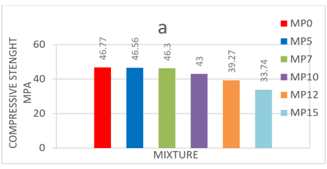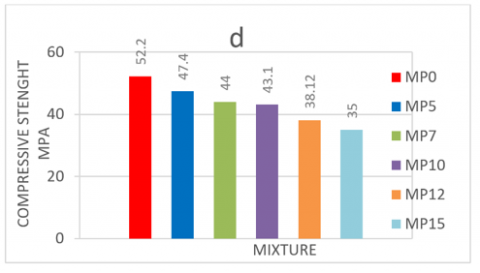The results displayed in Figure 17 show that the superior compressive strength is that of the control mortar obtained without the substitution of sand by plastic particles after 180 days (53.86MPa). The maximum reduction in compressive strength(~34) was noticed for MP15 composites containing 15% plastic particles.