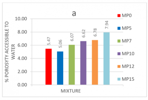 Figure 18(a) shows the test results of porosity accessible to water of geopolymer mortars. The geopolymer-based mortar without PET particles exhibits a water porosity of 5.47%. This value closely resembles those documented in various studies investigating the porosity of standardized mortars [32, 33].