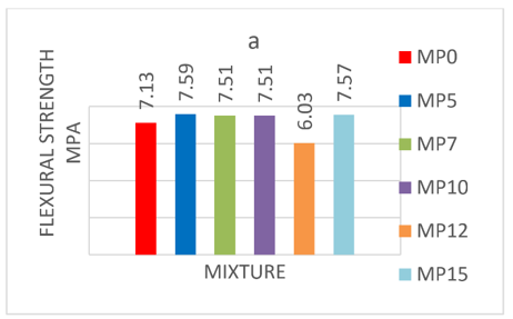 The results presented in Figure 19 show that the supreme flexural strength is that of the mortar obtained without substitution of sand by plastic particles after 180 days (12.33MPa). The maximum reduction in flexural strength after 180 day of curing (~17, 84) was notated for MP10 composites containing 10% of plastic particles (10.13MPa).