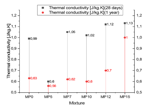As shown in Figure 21, the value of the MP0 control mortar was 0.99W W/m. K after 28 days of drying. This value decreased to 0.63W/m.K after 1 year of drying. The thermal conductivity of the MP5 mortar is lower than that of the control mortar (0.6W/m.K). After 28 days we found a decrease of around 39.4% in thermal conductivity and 0.56W/m.K, after 1 year of drying can be explained by the reduction of voids in the matrix due to the creation of the dense geopolymer matrix. Other studies have explored the thermal characteristics of geopolymer materials with polymeric additives as well. Studies [36, 37] show that the geopolymers’ thermal conductivity is affected by the material’s porosity, as well as, the filler materials’ location and their quantity. The results gave those studies support since including PET particles was shown to increase porosity and lower thermal conductivity. Nevertheless, our research suggest extending that knowledge by including information on the long term thermal performance of PET-modified geopolymers. This focus on PET modified geopolymers is not well covered in the existing literature.