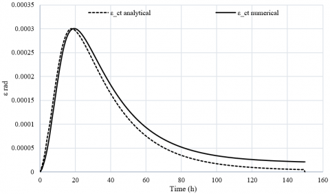 The analytical model is well validated according to the numerical variation of the radial crack strain: The strain reaches its maximum at the age of 20 hours: this age is relative to the maximum hydration concrete temperature: this temperature variation replaces the thermal load effect modelled at the hardened concrete case study.
