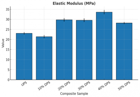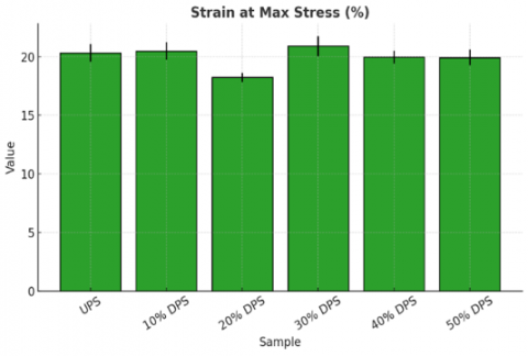 Mechanical properties of the composites revealed a decreasing trend of tensile strength of the composites with increasing DPS content with values of 43.95 MPa for neat UPS and 30.00 MPa at 40% DPS. On the other hand, the tensile modulus of the composites was found to have risen from 22.65 MPa for 0% DPS to 33.54 MPa at 40% DPS, which showed that the formula matrix stiffness was enhanced by the presence of rigid filler particles. Strain at break also decreased, from 2.91% (neat UPS) to 1.39% at 40% DPS, confirming reduced ductility with higher filler content.
