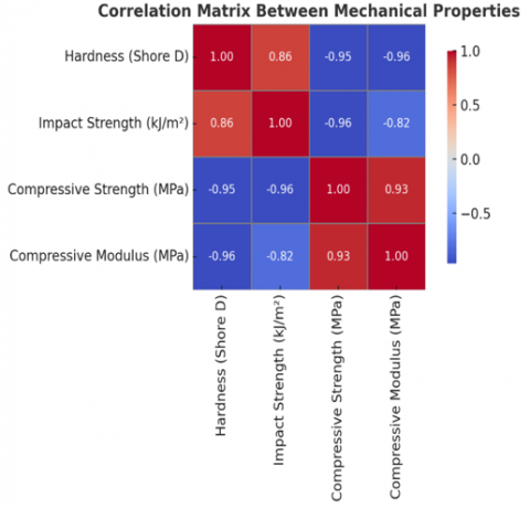 In summary, the correlation analysis confirms that the addition of DPS enhances impact strength and surface hardness at the expense of compressive strength and, to a lesser extent, compressive modulus. These trends are consistent with the mechanical behavior of many natural-fiber or particulate-filled polymer composites and underscore the importance of tailoring filler content based on the targeted application—whether it prioritizes toughness, rigidity, or load-bearing capacity.