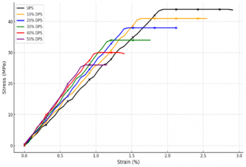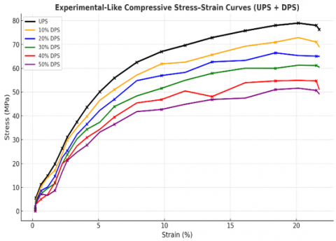 Figure 7 presents the stress-strain curves for DPS-reinforced composites were generated by scaling the UPS curve to reflect realistic reductions in stiffness and strength due to filler incorporation. These curves preserved the shape of the experimental UPS response but displayed progressively lower peak stresses and more moderate slopes. As DPS content increased, the curves shifted downward and became less steep, indicative of decreased load-bearing capacity and stiffness. This change in profile is consistent with the common behavior of particle-reinforced thermoset polymers, where excessive filler loading often leads to reduced matrix continuity, impaired stress transfer, and increased defect density such as voids or agglomerates.