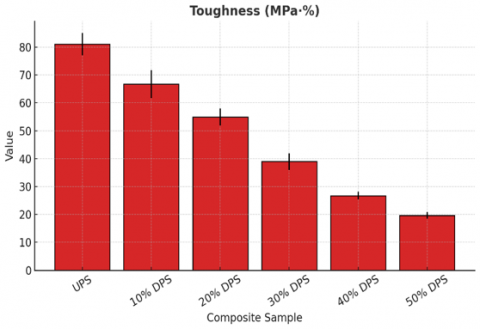 The toughness decreased drastically with increasing DPS content. As shown in Figure 11, the high toughness of ~1319 MPa·% for pure UPS was directly measured, indicating excellent energy absorption before failure. The value dropped to 1025 MPa·% in the 30% DPS sample, then to 923 MPa·% at 40% DPS. It is likely that the lower toughness of DPS composites results from diminished interfacial bonding and lower load transfer efficiency resulting in premature failure, and decreased energy absorption capacity [38]. This trend highlights the tradeoff that exists between a natural filler reinforced composite and environmental sustainability and cost efficiency yet at the expense of its robustness which is common in these types of composites.