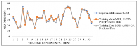 Figure 11. Comparative prediction performance of experimental results, ANFIS-PSO and ANFIS-GA of MRR of AL-8112 alloy for training data