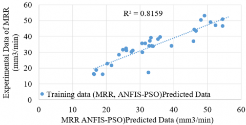 -For the testing process, the ANFIS-PSO prediction rate is 97% and 99% for the ANFIS-GA. This has shown that the hybrid model could predict the MRR for 5 cutting parameters at 5 levels.
