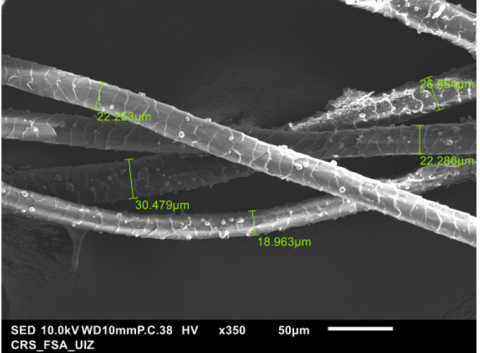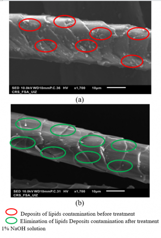 The treatment of sheep wool fibers was carried out by immersion in a 1% NaOH solution in order to neutralize the activity of microorganisms and rule out the treatment's effect on the microstructure of the fiber. SEM images before and after treatment are represented in the results section.