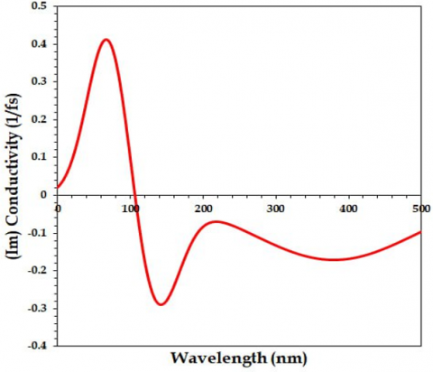 In Figure 14(a), the diagram shows the imaginary part of the optical conductivity for Phenyl-P over a wide range of wavelengths. Initially, there is a negative dip followed by stabilization, indicating complex interactions between the material and electromagnetic fields at shorter wavelengths. After around 2000 nm, the conductivity approaches near-zero values, suggesting that phenol-P has limited polarization effects at longer wavelengths, mostly in the visible and infrared range. Given this trend, there is little interaction with longer light wavelengths after a strong initial energy storage period [45].