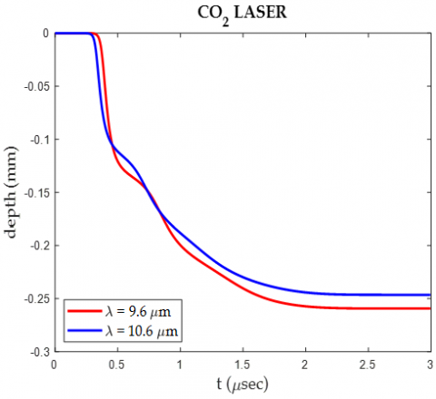 The Figure 3 shows, over time, the depth of drilling into a sample—likely teeth—when exposed to a CO2 laser of wavelengths of 9.6 µm and 10.6 µm. Both wavelengths cause a rapid initial increase in depth, with the 9.6 µm wavelength penetrating slightly faster and deeper than the 10.6 µm wavelength. After the initial sharp increase, the depth growth slows and eventually stabilizes, with the final depth being slightly greater for the 9.6 µm wavelength, indicating that it is marginally more effective in achieving deeper penetration.