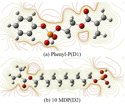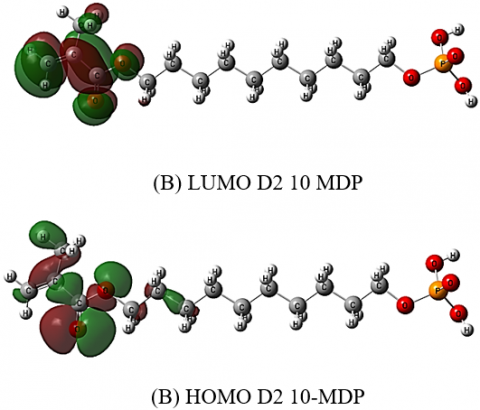 Through the calculations listed in the table, we notice that D1 Phenyl-P appears to be more electronegative and electrophilic, with a higher ionization potential and electron affinity, making it more effective in electron-accepting roles compared to D2 10-MDP. D2, on the other hand, has slightly lower electronegativity and ionization potential, suggesting it may be more efficient in electron-donating processes, which could influence its behavior in dental applications.