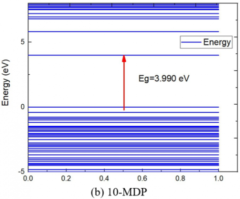While the Figure 8(b) illustrates the electrostatic potential map of 10-MDP (10-Methacryloyloxydecyl dihydrogen phosphate) reveals key functional regions within the molecule. The phosphate group exhibits high electron density, making it highly negative and ideal for bonding interactions, particularly in dental applications where it binds with calcium in tooth enamel. The central alkyl chain is non-polar, showing uniform low electrostatic potential, which contributes to the molecule's hydrophobicity and flexibility. The methacrylate group has moderate electron density, indicating its reactivity in polymerization processes, crucial for forming strong adhesive bonds. This distribution highlights the molecule's effectiveness in both adhesion and structural integrity in dental materials [38].